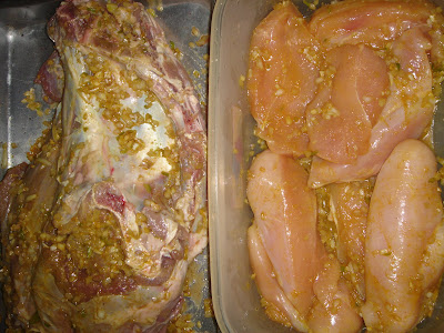 Corte a carme em cubos grandes, para que oa marinada possa entranhar bem. (Como os peitos de frango estavam muito grossos eu os abri em dois. Quanto ao pernil de carneiro, achei melhor deixá-lo inteiro e assá-lo no forno). Cubra a carne já misturada a marinada e gele.